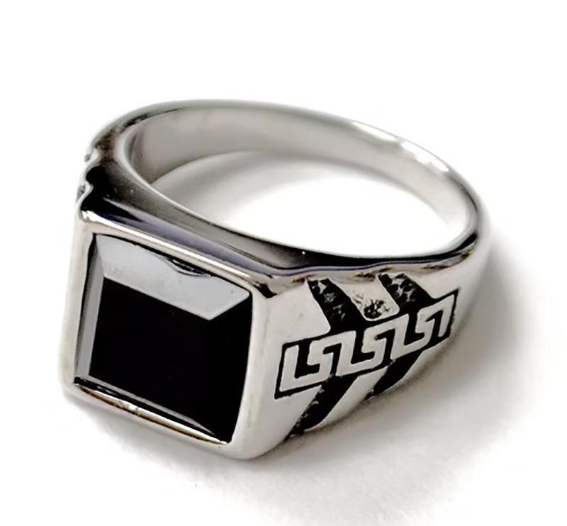 Anillo casual con piedra onix de 12x14mm con diseño de S a los laterales y 2 flechas ancho 3.5mm plateado