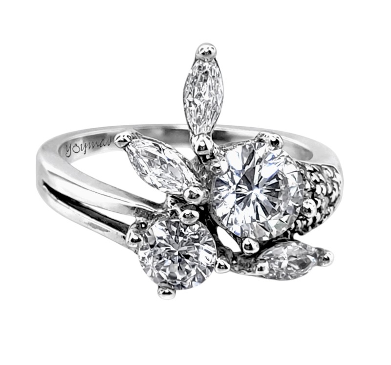 Anillo con diseño irregular con 3 piedras marquesa de 2.5x4mm y 1 circonia de 5mm y 1 de 6mm en montura de dientes y circonias pequeñas a uno de los lados y al otro lateral calado