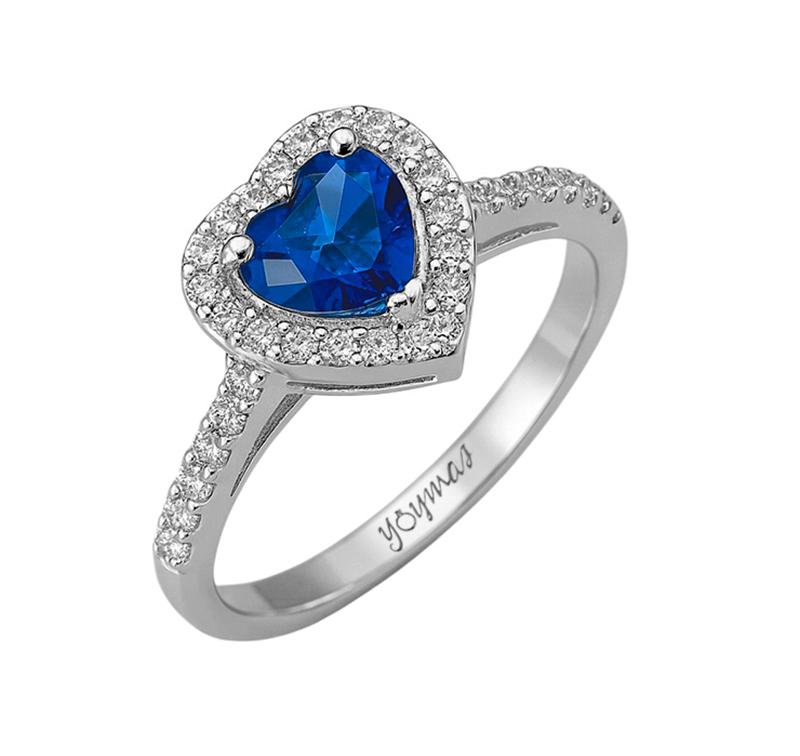 Anillo casual en forma y con circonia de corazón de 5mm y halo de circonias de 1mm con 7 circonias 1mm cada lateral con un Diamante de 1mm 0.5 pts incrustado en la parte interna de anillo ancho 2mm