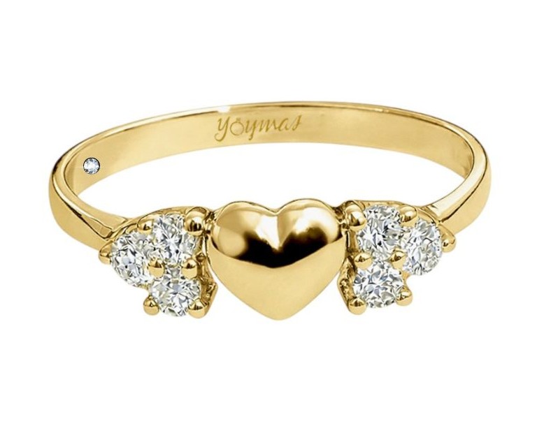 Anillo casual con corazón liso al centro y 3 circonias de 1.5mm en forma de triangulo a cada lateral con un Diamante de 1mm 0.5pts incrustado en la parte interna del anillo ancho 1.5mm 10K