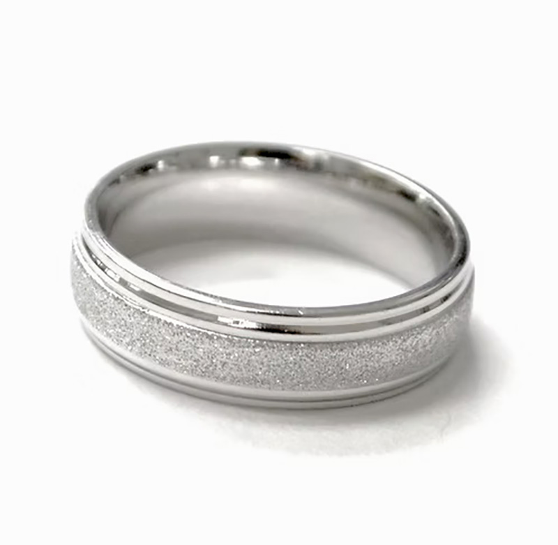 Argolla con acabado mateado de arena al centro con doble linea de diamantado a las orillas ancho 6mm plateada