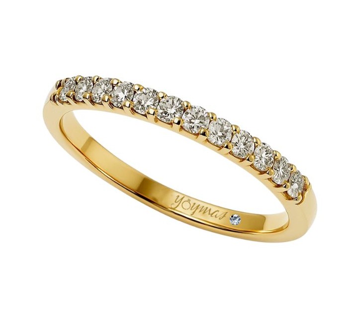 Argolla media churumbela con circonias de 1.5mm con leve separación (12 piedras aproximadamente) con un Diamante de 1mm (0.5puntos) incrustado en la parte interna del anillo ancho 2.4mm