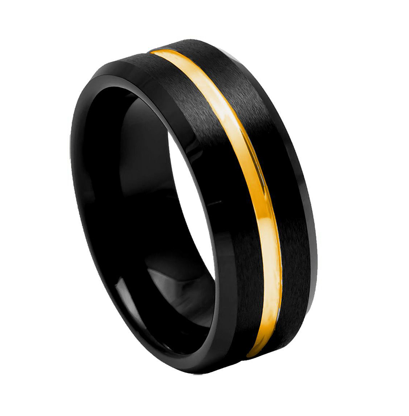 Argolla negra mate con linea dorada al centro Tungs. 8mm