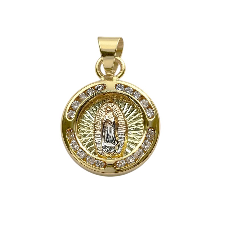 Dije medalla Virgen Guadalupe al centro 3 oros diamantado halo C/Z canal 11.3mm 10K 14
