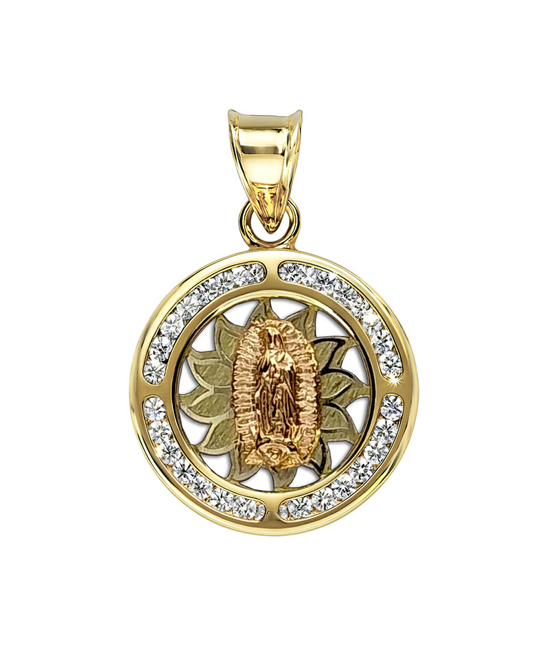 Dije medalla Virgen Guadalupe al centro OR diamantado forma flor halo C/Z canal 16mm 10K 26